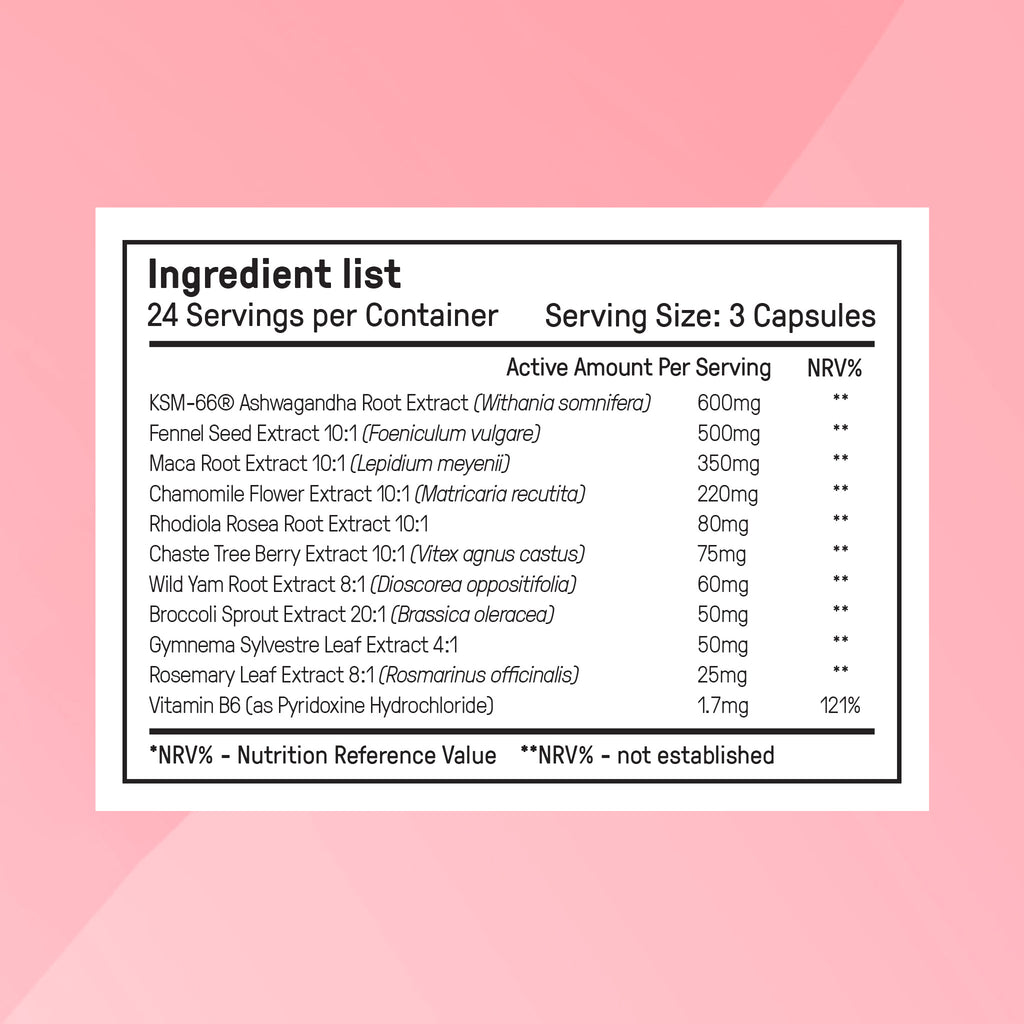 Maca-Extrakt 10:1 [2000 mg]; Kamillenextrakt 2 % Flavone, 1,2 % bis 2,5 % Apigenin, 4- 10:1 [1200 mg]; Ashwagandha-Extrakt 25:1 [1200 mg]; Fenchelsamenextrakt 10:1 [900 mg]; Keuschbaumbeerenextrakt 0,5 % 10:1 [700 mg]; Rhodiola Rosea Extrakt (Rhodiola5PlusTM) 3 % Rosavins+2 % Salidrosid HPLC 10:1 [680 mg]; Amerikanischer Ginsengwurzel Extrakt 8:1 [520 mg]; Rosmarin Extrakt 7,5 % Rosmarinsäure HPLC 8:1 [200 mg]; Gymnema Sylvestre Extrakt 4:1 [160 mg]: Berberin-Extrakt 6:1 150 mg